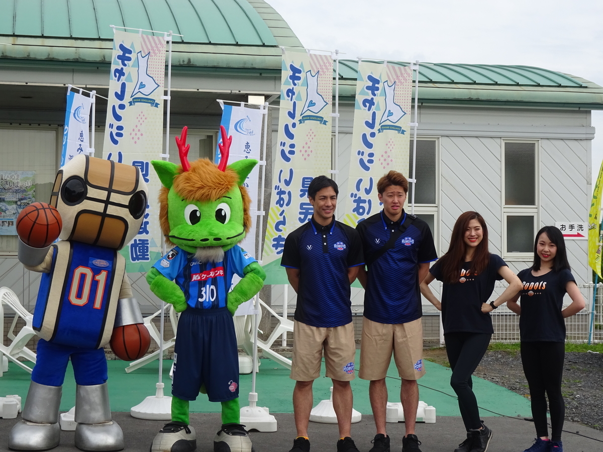 また,茨城ロボッツから,友利健哉選手と高橋祐二選手,チームマスコットの「ロボスケ」くん,RDT(ロボッツダンスチーム)のASUKAさんとNOZOMIさんに,水戸ホーリーホックからホーリーくんにも参加いただきました。