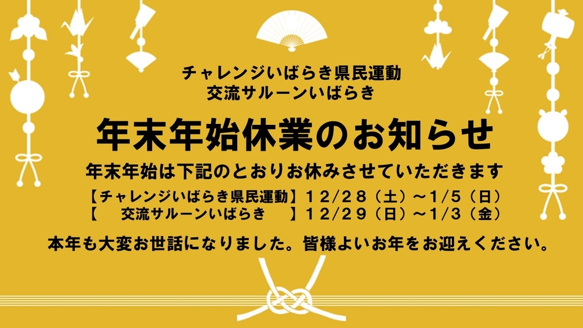 チャレンジいばらき県民運動と交流サルーンいばらきは,年末年始下記のとおりお休みさせていただきます。