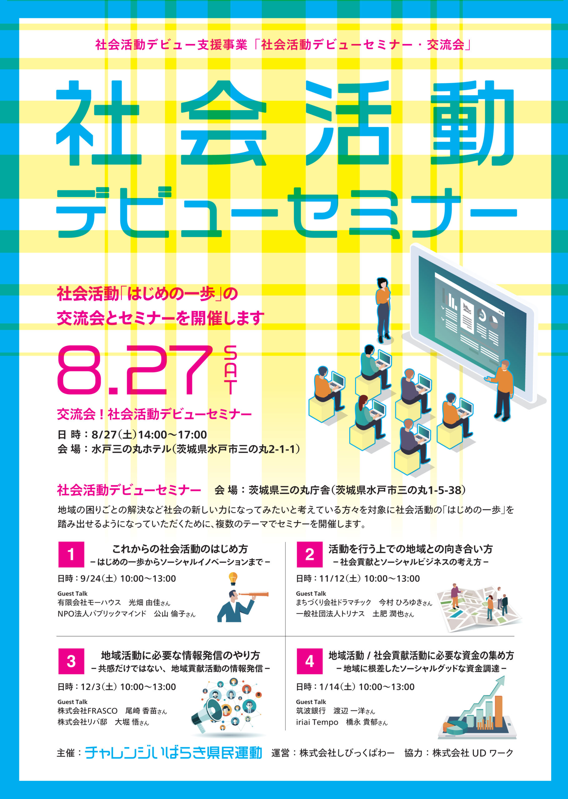 この交流会は、地域の困りごとの解決など、社会の新しい力になってみたいと考えている方に向けた「社会活動デビューセミナー」に先がけて行います。社会活動の「はじめの一歩」から仲間づくりまで、あなたのチャレンジを応援します!