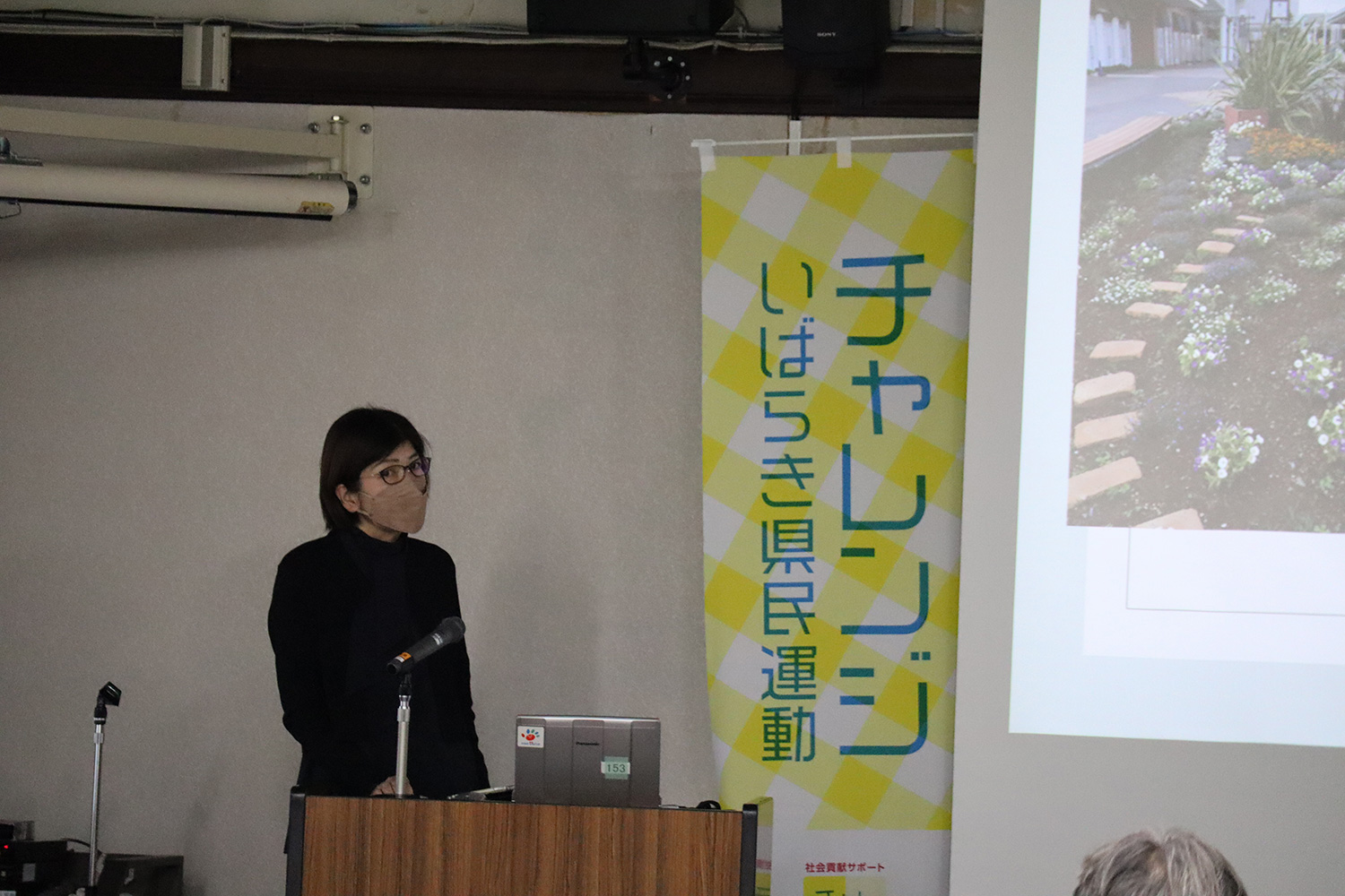 その後、同じく会員の株式会社坂田園芸 代表取締役社長 完賀裕子先生から『お花いっぱいショッツピングセンター花壇のお話』として、ショッピングセンターの花壇を例に花苗の植栽の方法で、見映えのある花壇になることを教えていただきました。