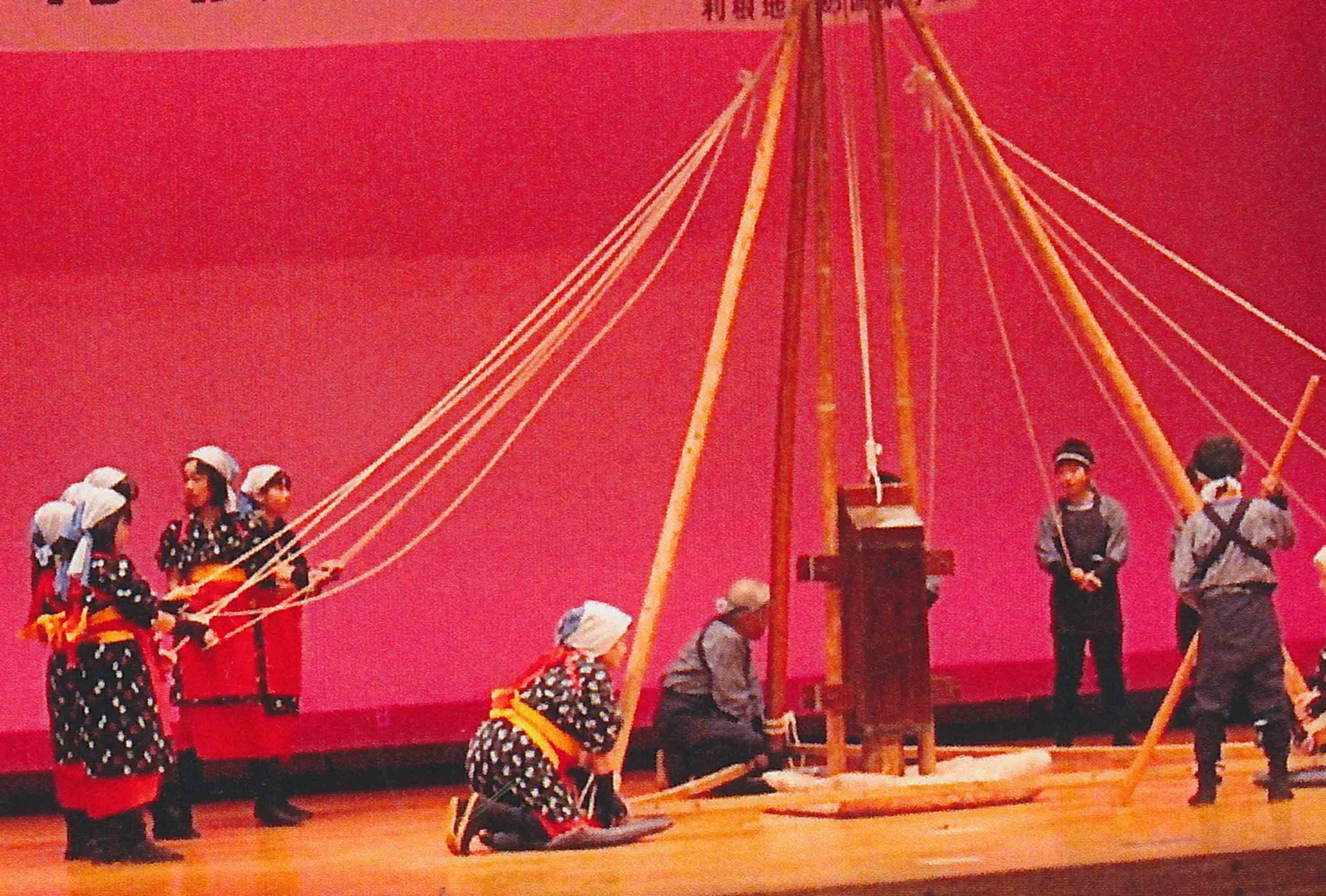 「地固め唄」は,江戸時代に行われた築堤・改修工事などで作業者を励ますために唄われていた作業歌です。地固め唄には,堤防の法面を固める「土羽どは打ち唄」,土をつき固める「たこつき唄」,沈床工事などで杭を打つ「杭打ち唄」がありますが,これらはいずれも作業者の動きをそろえる目的で唄われたものです。