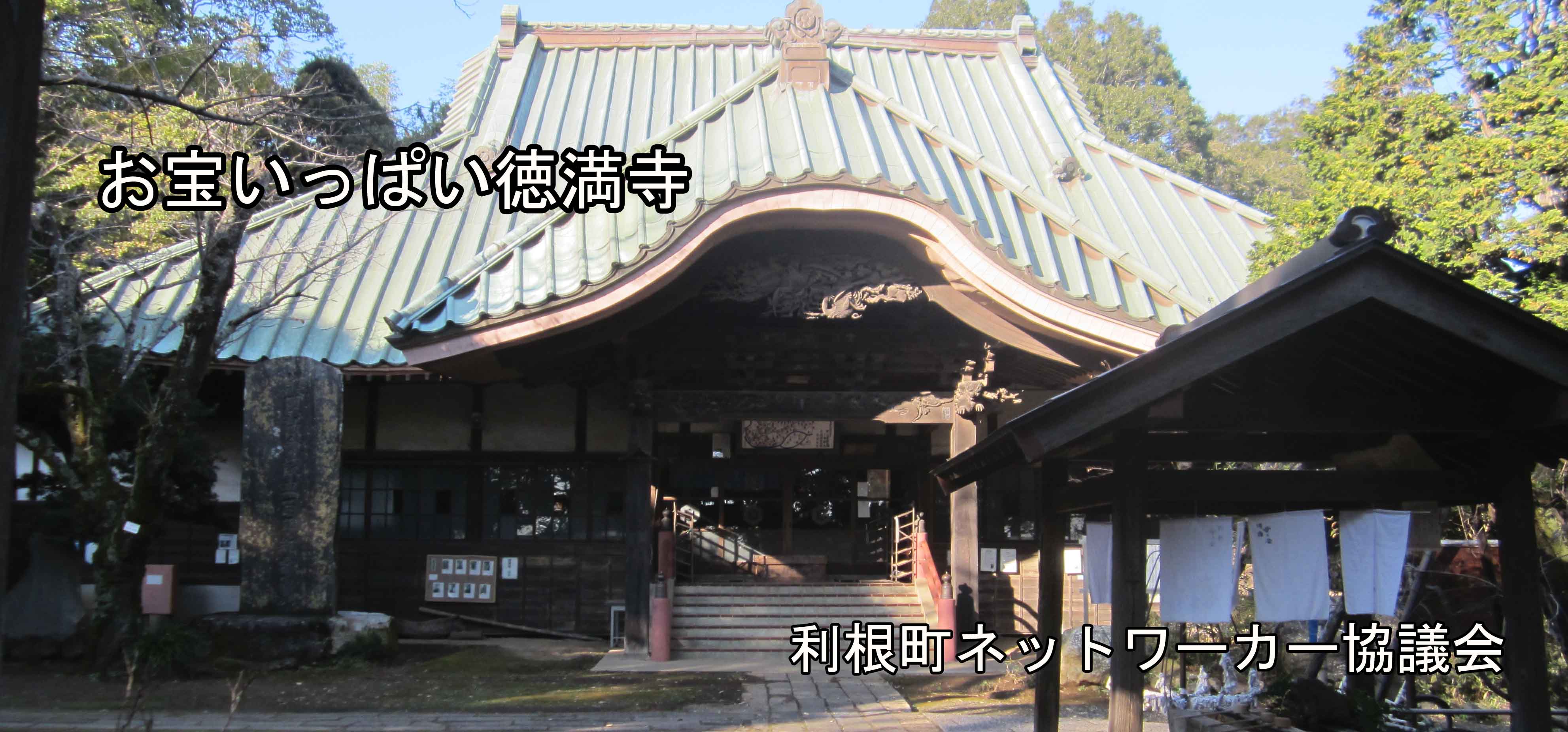 徳満寺の寺宝「金剛板両界曼荼羅(こんどうばんりょうかいまんだら)」は,利根町の唯一の国指定重要文化財です。曼荼羅は一面が横約50cm,縦約100cmの金剛界,胎蔵界の二面で,それぞれ9枚の金銅板から成り立っています。曼荼羅は絹本が一般的で,金銅板のものは全国で唯一の逸品です。現在は上野の東京国立博物館に寄託され,徳満寺の客殿にはレプリカが飾られています。