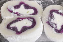こうして育てられた紫いもを使って、何かできないかと考えた結果完成したのが、「ポピー大福」なのです。 大福を切ると、その切り口は、ポピーをイメージした形になっています。