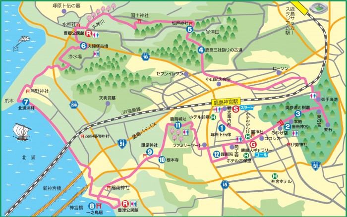 鹿嶋市に5月25日、本格的なウォーキングコース「鹿嶋 神の道」(約15km)がオープンしました。鹿嶋市の顔である鹿島神宮を中心とする歴史と伝統ある多くの文化財や,神秘的な森と雄大な湖を有する自然環境を結びつけた、まち自慢のコース設定です。またコース整備は市民活動支援制度を活用し、市民と行政、地区住民が一体となって進められただけに、きっと鹿嶋人と観光客の心のこもったふれ合いの場になるものと思います。