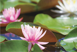 澄んだ池の中には、メダカやフナが泳ぐ姿が見られます。また、ガクアジサイ、ハナショウブ等の草花が咲き誇り、一番の見頃である6~7月には、睡蓮のピンクと白の彩りが鮮やかに添えられます。