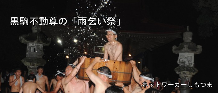 黒駒不動尊は、入口の間口が狭く、小さい鳥居がひっそりとたたずんでいるため、普段は一見見過ごしてしまいがちですが、境内は広く、まつり当日は、大勢の人で賑わいます。雨乞い祭のクライマックスである水かけは午後8時ころから始まり、タライから勢いよく水が浴びせられるので、濡れる覚悟でお越しください。また、まつりの最後にはご利益のあるおにぎりが配られます。