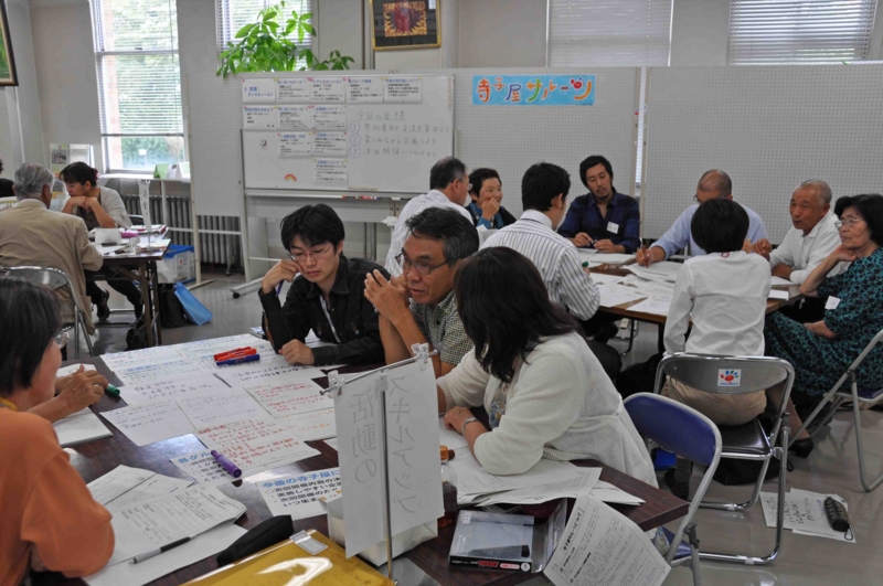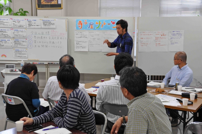参加者は,「活動のスキルアップ」,「地域づくり」,「子ども・青少年」のグループに分かれ,自己紹介や寺子屋サルーンに期待する事について話をした後,
