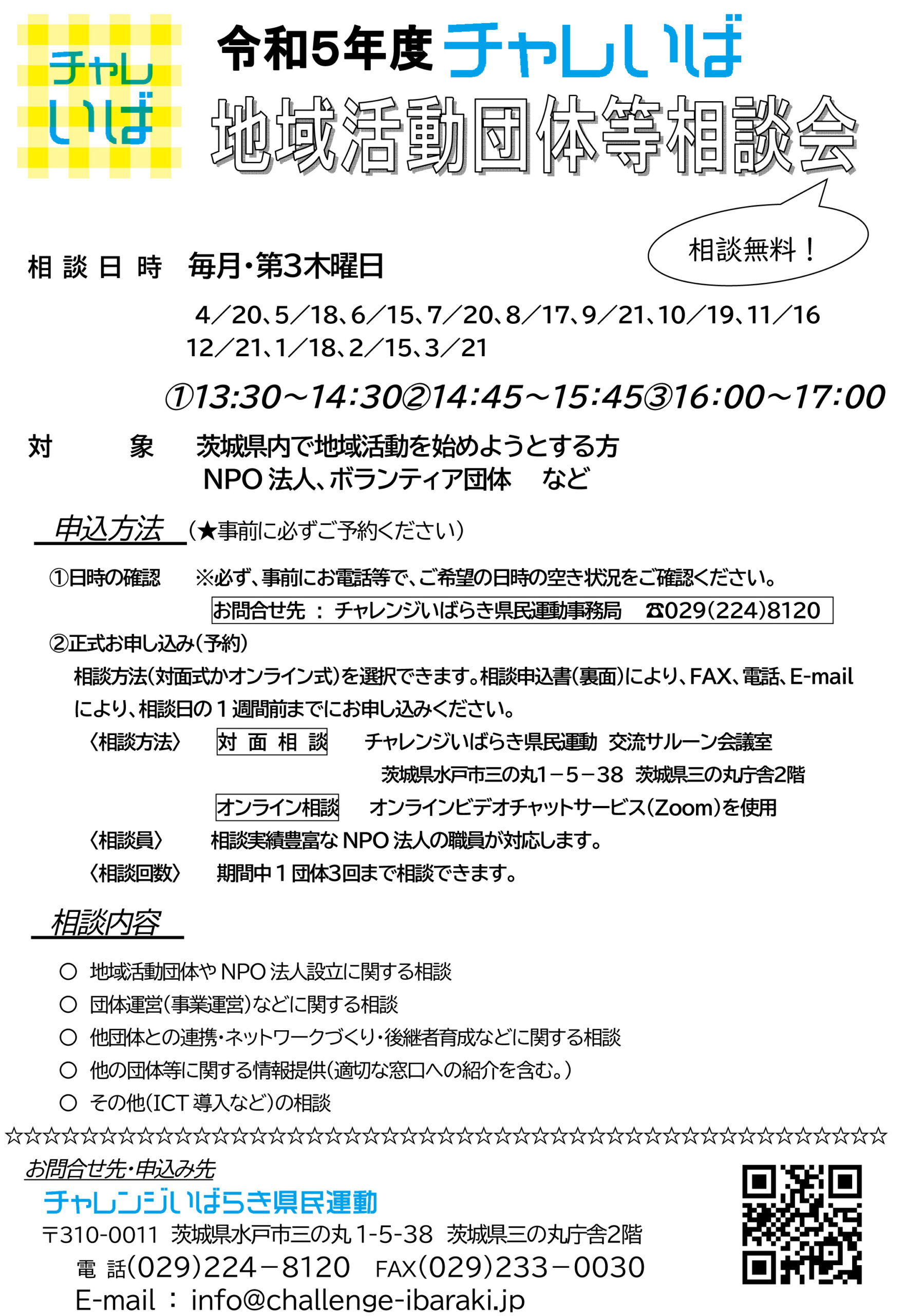 | 5.相談方法 | 対面式かオンライン式かお選びください。 ■ 対面式 実施場所:チャレンジいばらき県民運動 交流サルーン会議室 (茨城県水戸市三の丸 1-5-38 茨城県三の丸庁舎2階)