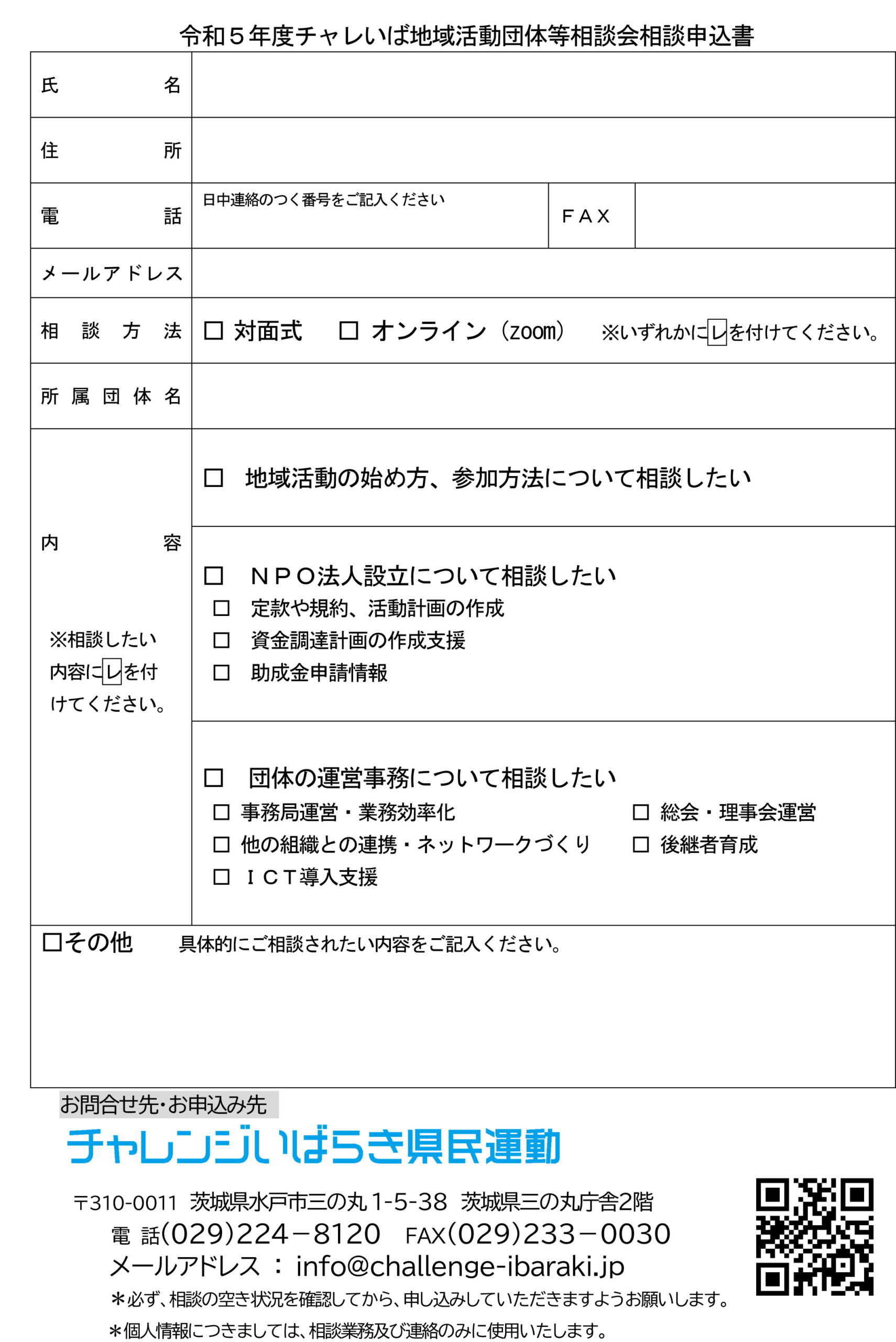 | 7.問合せ | お電話、e-mail または問い合わせフォームよりチャレンジいばらき県民運動事務局へお問い合わせください。 ■ 電話 029-224-8120 ■ Eメールアドレス info@challenge-ibaraki.jp | 8.様 式 |